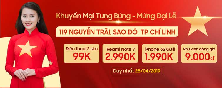 Di Động Thông Minh 32 Thái Học 2, Sao Đỏ, tp Chí Linh đã trở thành 1 điểm đến quen thuộc của người dân nơi đây, với 1 không gian trải nghiệm rộng rãi, nơi các bạn sinh viên, khách hàng có thể mua được những Smartphone Samsung, Oppo, Xiaomi, Vsmart chính hãng rẻ nhất Hải Dương, iPhone iPad zin nguyên bản. Nhằm tiếp tục tri ân khách hàng cũng như hòa chung vào không khí hào hùng của đất nước chào đón đại lễ 30/04 và 1/5, đúng 08h sáng 28/04/2019 chủ nhật tuần này Di Động Thông Minh xin gửi tới các bạn chương trình đặc biệt: “Khuyến mại tưng bừng, mừng Đại Lễ: Điện thoại 2 sim 99K, iPhone 6S 1.990K, Phụ kiện từ 9.000đ” tại 32 Thái Học 2, Sao Đỏ, khách hàng sẽ có cơ hội mua: