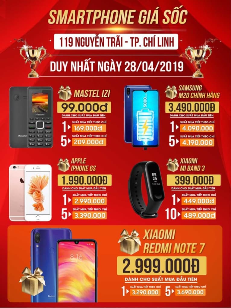 Tại 32 Thái Học 2, Sao Đỏ, Chí Linh trong ngày vàng khuyến mại, Di Động Thông Minh sẽ tổ chức chương trình bán hàng giá sốc dành cho rất nhiều Smartphone. Khách đến sớm nhất sẽ có cơ hội mua các suất ưu đãi iPhone 6S, Redmi Note 7, Galaxy M20… giá sốc. Chi tiết như sau: