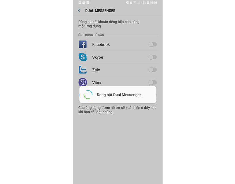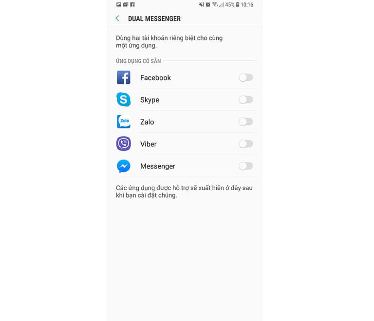 Ở đây, bạn sẽ thấy được Galaxy S9 và Galaxy S9+ sẽ đang hỗ trợ các ứng dụng tương thích tính năng Dual Messenger như Facebook, Skype, Viber, Zalo…