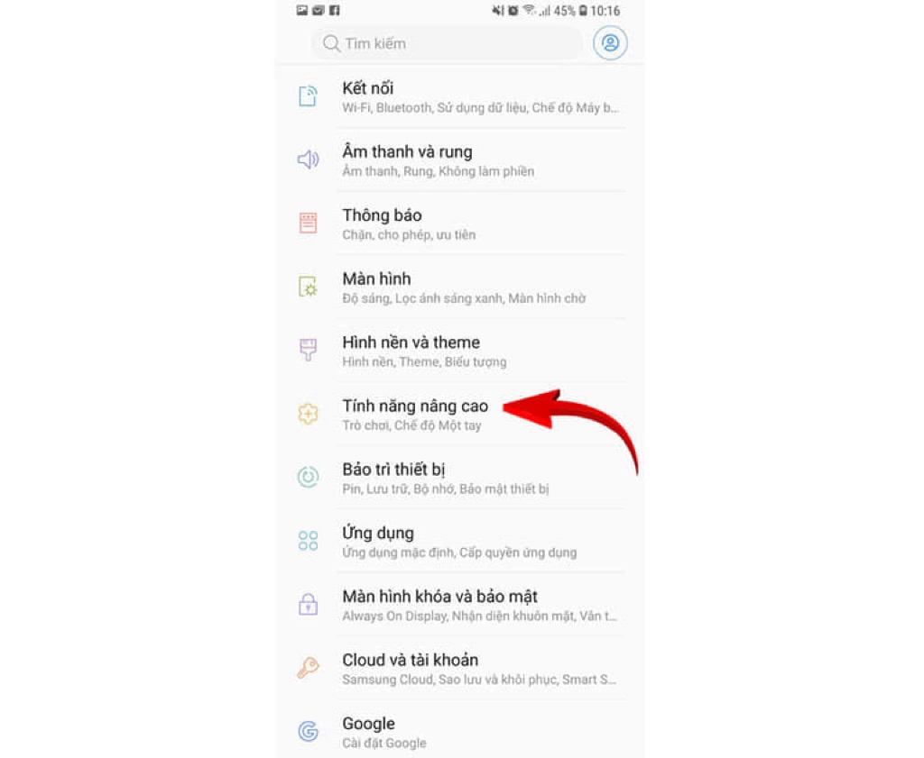 Tìm và đi vào tùy chọn Tính năng nâng cao.