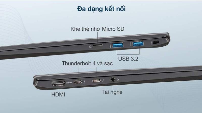 Bên trái máy có 01 jack tai nghe 3.5mm, 01 cổng HDMI, 02 cổng USB type C hỗ trợ Thunderbolt 4 vừa sạc vừa truyền dữ liệu tốc độ cao, tối đa 40Gbps, xuất 2 màn hình 4K hay 1 màn hình 8K với chất lượng kết nối ổn định.