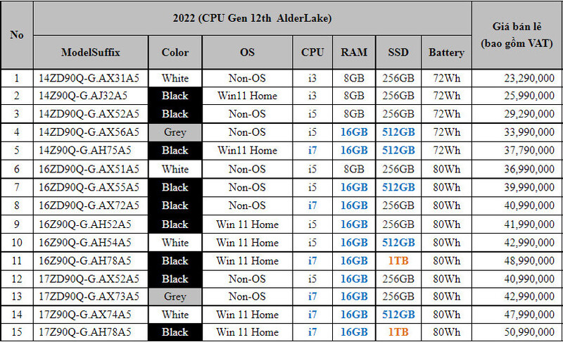 Lg gram 2022 có 15 sản phẩm được được phân loại tùy theo cấu hình thiết kế kèm giá niêm yết của hãng