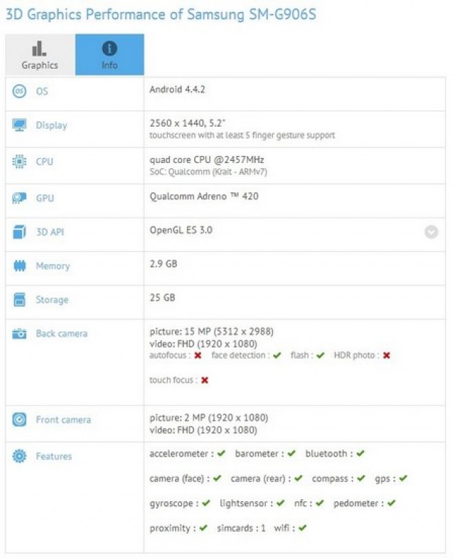 Theo thông tin được đăng tải trên trang web của công cụ chấm điểm (benchmark) hệ thống GFXBench, một sản phẩm bí mật của Samsung với tên mã SM-G906S đã gây chú ý với giới công nghệ vì cấu hình cực “khủng” mà chiếc smartphone này trang bị. Thiết bị có tên mã SM-G906S, trong khi đó Galaxy S5 có mã là SM-G900. Hiện chưa rõ đây là phiên bản cao cấp của Galaxy S5 hay là một dòng sản phẩm hoàn toàn mới của Samsung.