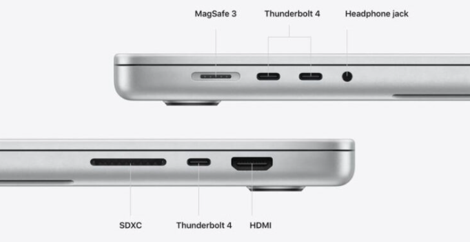 MacBook Pro 14 inch M1 Pro lần này sở hữu ba cổng Thunderbolt 4, một cổng HDMI, một khe cắm thẻ SDXC và một cổng MagSafe 3.