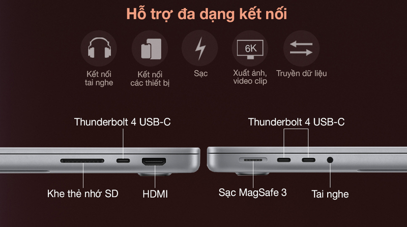 Máy tính Macbook Pro 14 inch 2021 đã được Apple đem lại các cổng kết nối đầy đủ hơn gồm: 3 cổng Thunderbolt 4, HDMI, khe thẻ SD, Jack tai nghe 3.5mm và cổng sạc Mag Safe 3 thay vì chỉ có cổng Thunderbolt và 3.5mm như trên thế hệ cũ, điều đó giúp người dùng sẵn sàng sử dụng hơn và không cần phải mua thêm các adapter chuyển đổi tốn thêm chi phí cũng như công mang theo mỗi khi cần sử dụng.