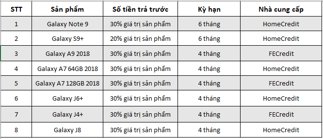 Bảng giá trả góp các smartphone Samsung chính hãng tại DDTM