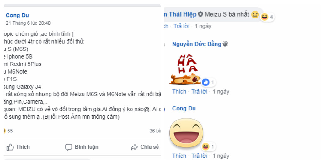 Đây tất nhiên là những ý kiến chủ quan của mình cũng tại vì mình quá thích sản phẩm này. Vậy còn những người dùng khác có suy nghĩ thế nào vè Meizu M6s , mời các bạn xe qua vài bình luận trên fanpage Meizu Việt Nam – Flyme OS Quality for Young :