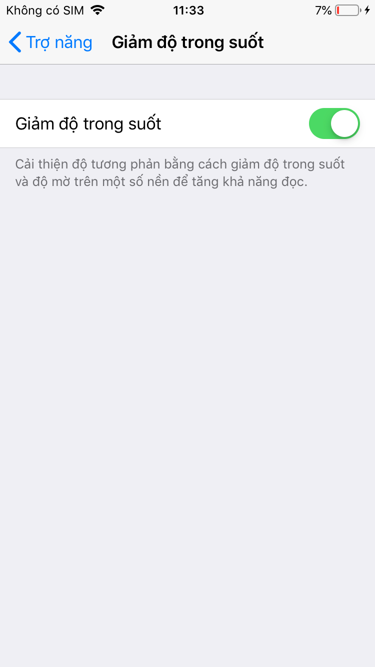 Để bật tính năng này các bạn truy cập vào : Cài đặt – Cài đặt chung -Trợ năng – Giảm độ trong suốt và bật tính năng này lên