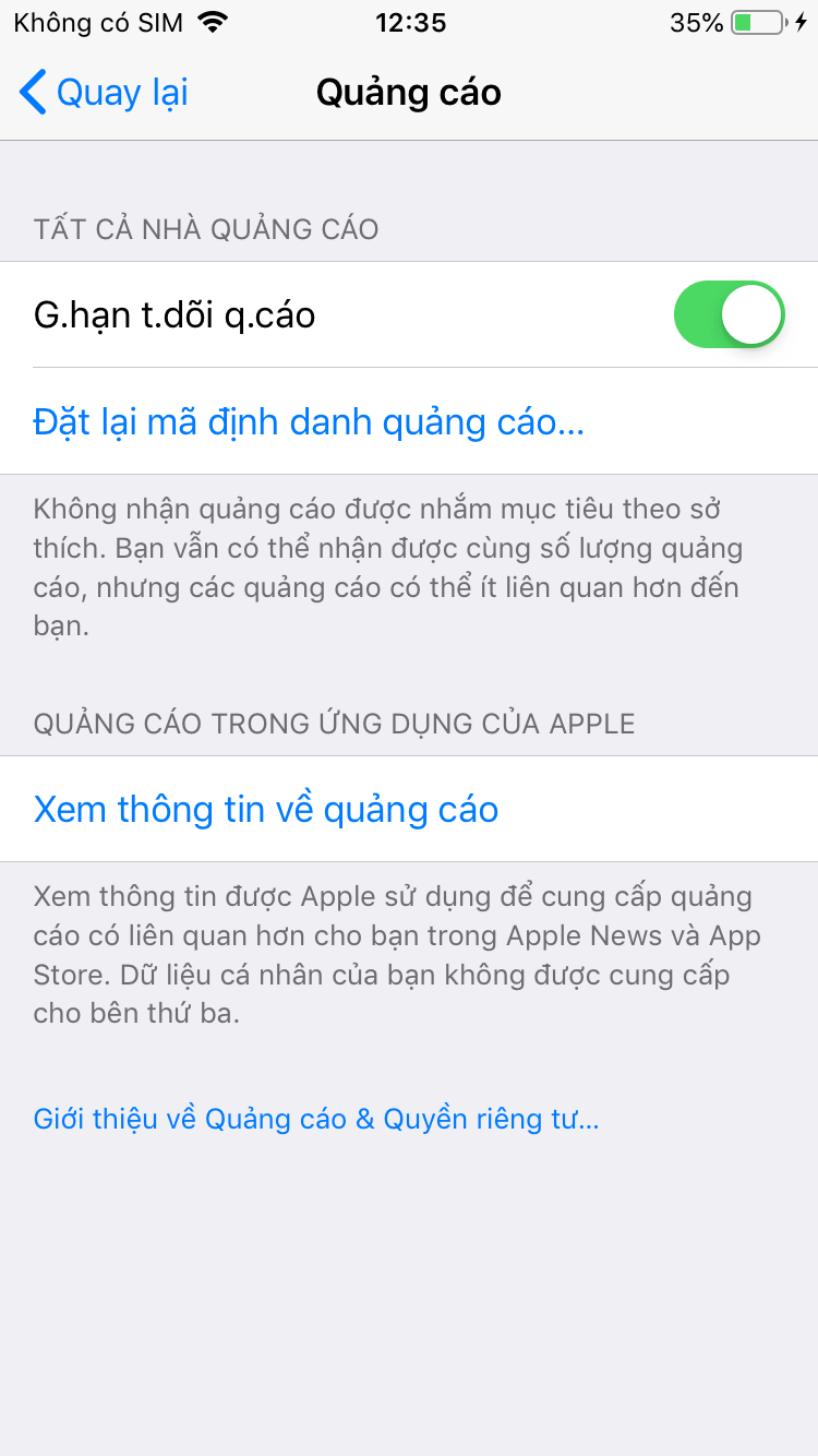Quảng cáo : Cài đặt – Quyền riêng tư – Quảng cáo – Giới hạn theo dõi quảng cáo – On