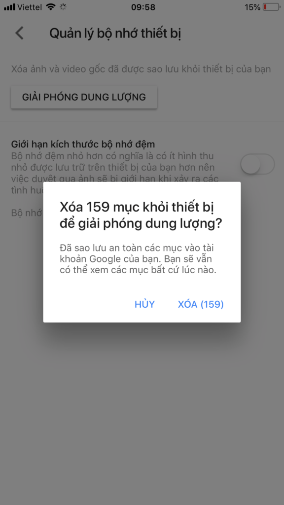 Điều này đồng nghĩ với việc bạn đồng ý xóa tất cả hình ảnh cũng như video có trong thư viện của iPhone của mình để giải phóng bộ nhớ thiết bị. Bạn yên tâm là tất cả chúng đã được sao lưu an toàn trên Google Photo và bạn vẫn có thể xem lại chúng bất cứ lúc nào thông qua ứng dụng. Bạn cũng có thể vào Thư viện điện thoại xóa thủ công nếu không muốn xóa tất cả chúng.