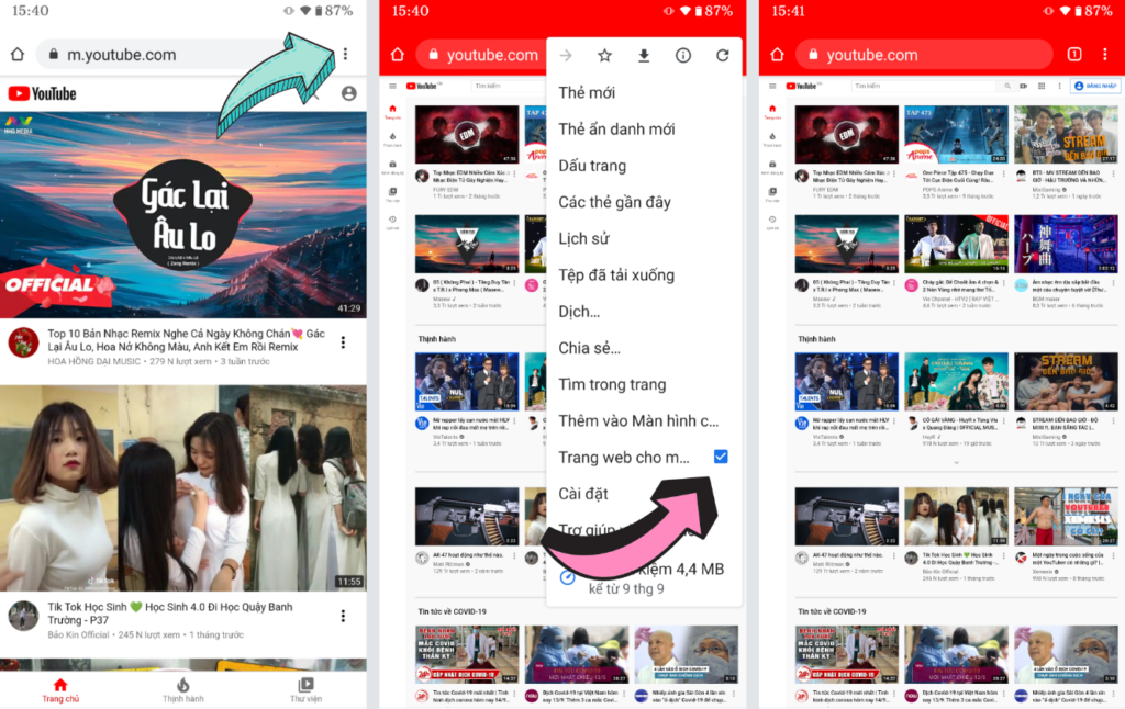 - Bước 2: Góc trên cùng bên phải màn hình, bấm vào dấu ba chấm rồi chọn tick dòng “Trang web dành cho máy tính đề bàn”. Máy sẽ tự tải lại trang web, lúc này giao diện đã được chuyển sang giao diện của máy tính để bàn.