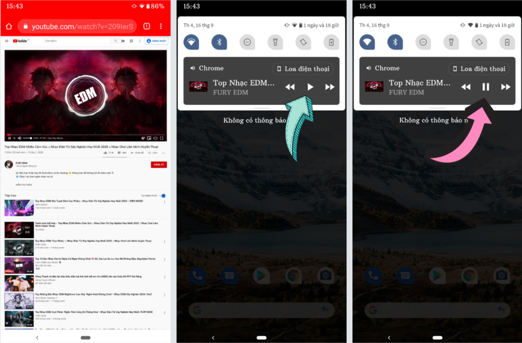 - Bước 3: Chọn Video muốn nghe bấm phát, sau đó bấm phím home để thoát ra màn hình chính. Lúc này máy sẽ dừng nhạc, kéo thanh thông báo trạng thái xuống bấm biểu tượng phát nhạc thì video lập tức được bắt đầu ngay.