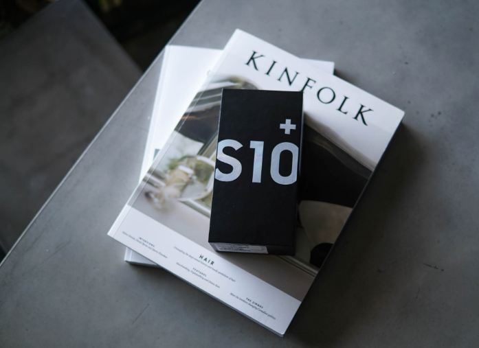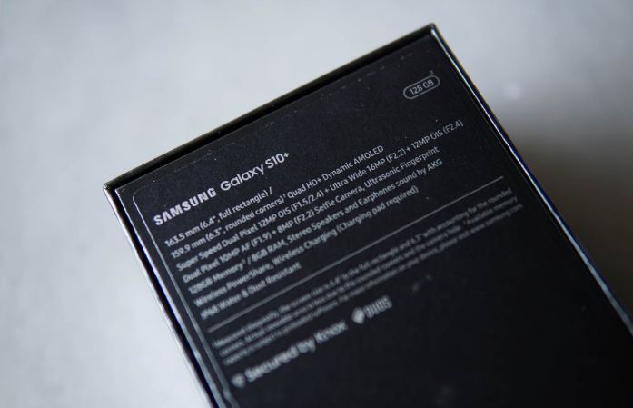 Về hộp, Galaxy S10 và S10+ có cách đóng gói khác so với 2 tiền nhiệm. logo S10 lớn chiếm hết 1/3 mặt trước của hộp, logo được dập vân chìm ánh kim như mặt lưng sản phẩm.