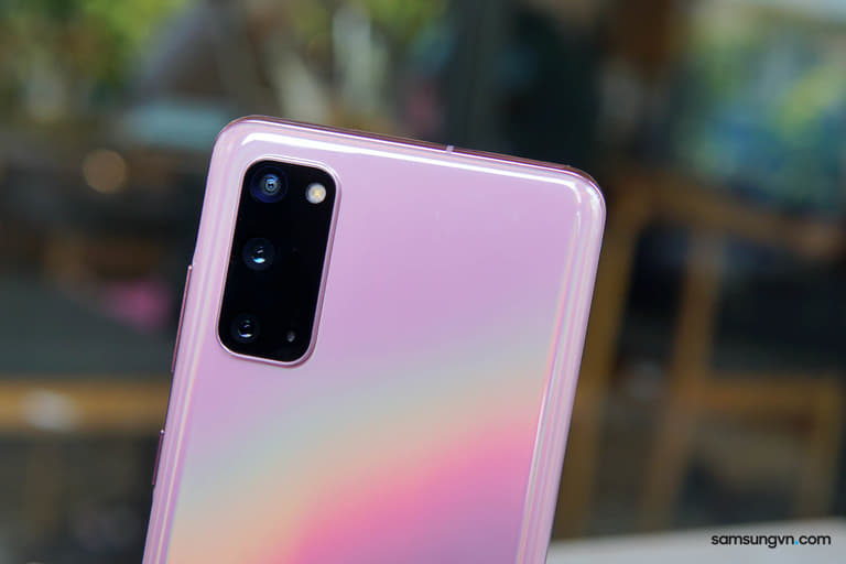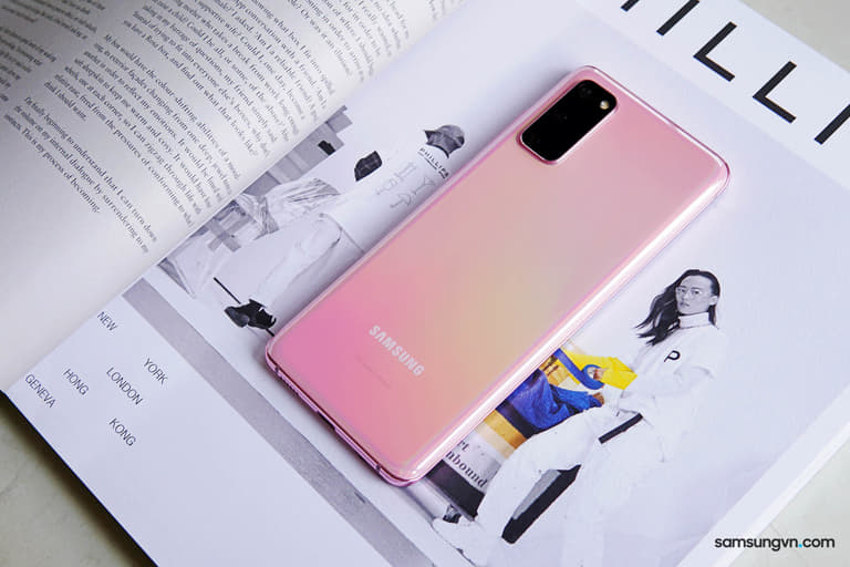 Mặt lưng màu hồng của Galaxy S20 khá ngọt ngào và nữ tính, với phần camera chữ nhật khá nổi bật!!! (Ảnh nguồn: samsungvn.com)