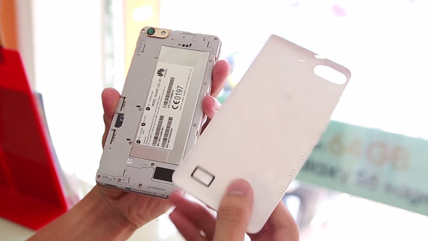 Ở mặt sau chúng ta sẽ có 1 nắp lưng bằng nhựa với họa tiết vân phay xước chéo giả kim loại nhìn rất bắt mắt, chống bám vân tay và mồ hôi cực tốt, có thể tháo rời bên trong để lắp 2 sim và thẻ nhớ. Tuy nhiên viên pin cố định không thể thay thế. Góc trên là cụm camera chính và đèn Flash Led, 1 mic phụ hỗ trợ quay video. ở giữa có logo Huawei. Loa ngoài được đặt ở phía dưới.