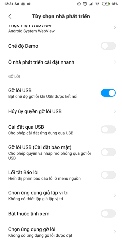 Cài đặt – Tùy chọn nhà phát triển – Gỡ lỗi USB