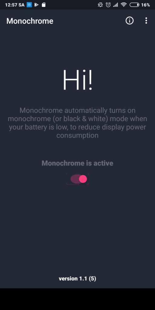 - Sau khi đã hoàn tất, bạn chỉ cần mở Monochrome lên, rồi chạy ứng dụng bằng thanh trượt ở giữa màn hình. Ứng dụng sẽ thông báo tự khởi động mỗi khi máy báo pin thấp để biến màn hình thành trắng đen.