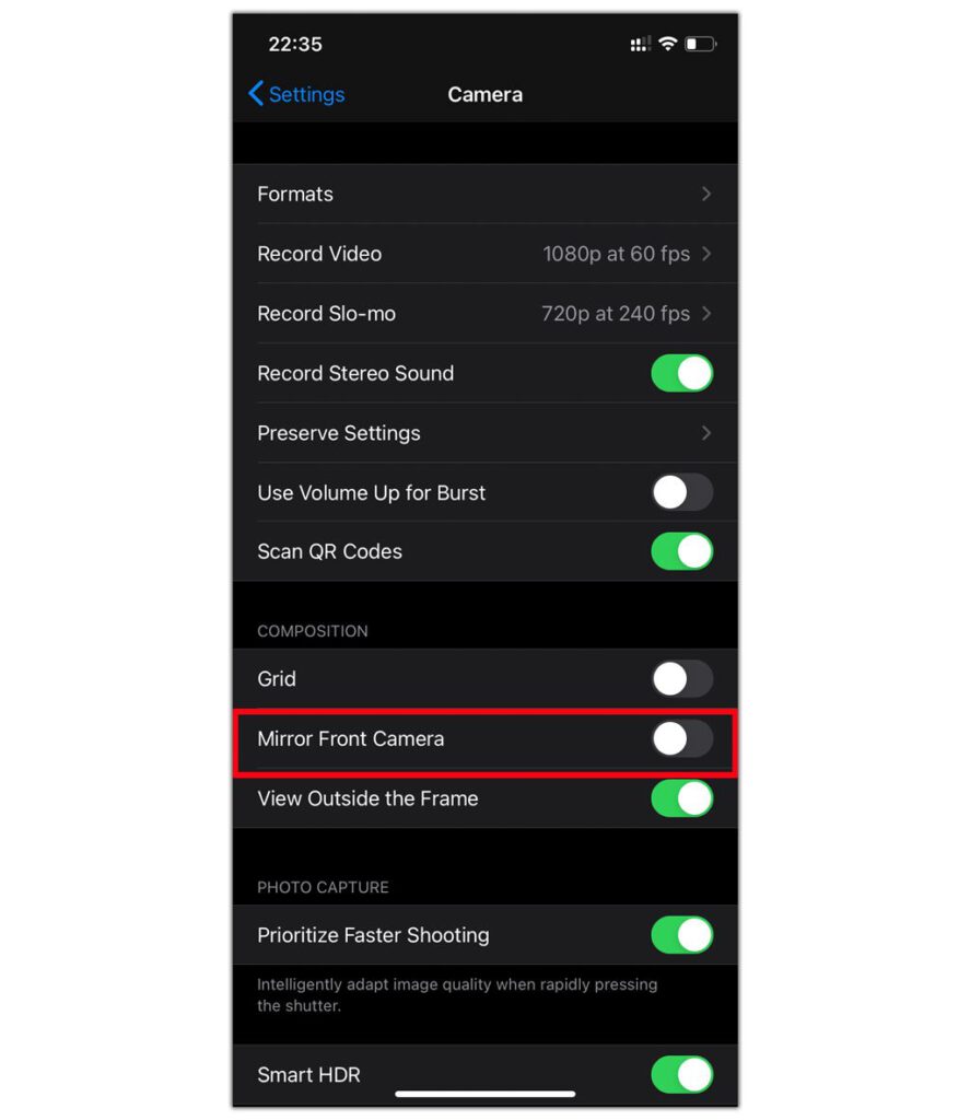 iOS 14 mới bổ sung tinh năng có tên là Mirror Front Camera cho phép sau khi người dùng kích hoạt lên chụp ảnh sẽ không còn bị ngược. Vào Settings, Camera trong mục Composition gạt On dòng Mirror Front Camera.
