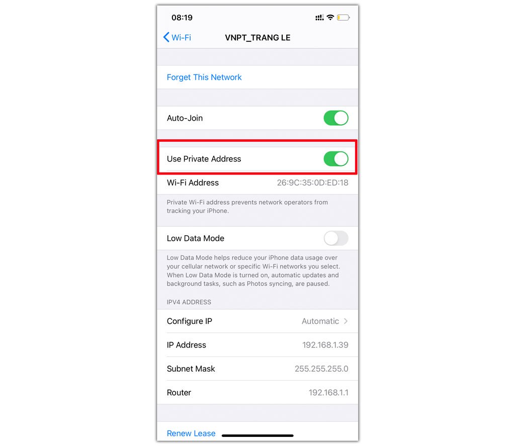 Khi đã kết nối đến một mạng Wifi, bấm vào tên mạng Wifi đó sẽ có một tuỳ chọn mới là “Use Private Address” để ngăn những người admin của mạng wifi đó theo dõi iPhone của bạn.