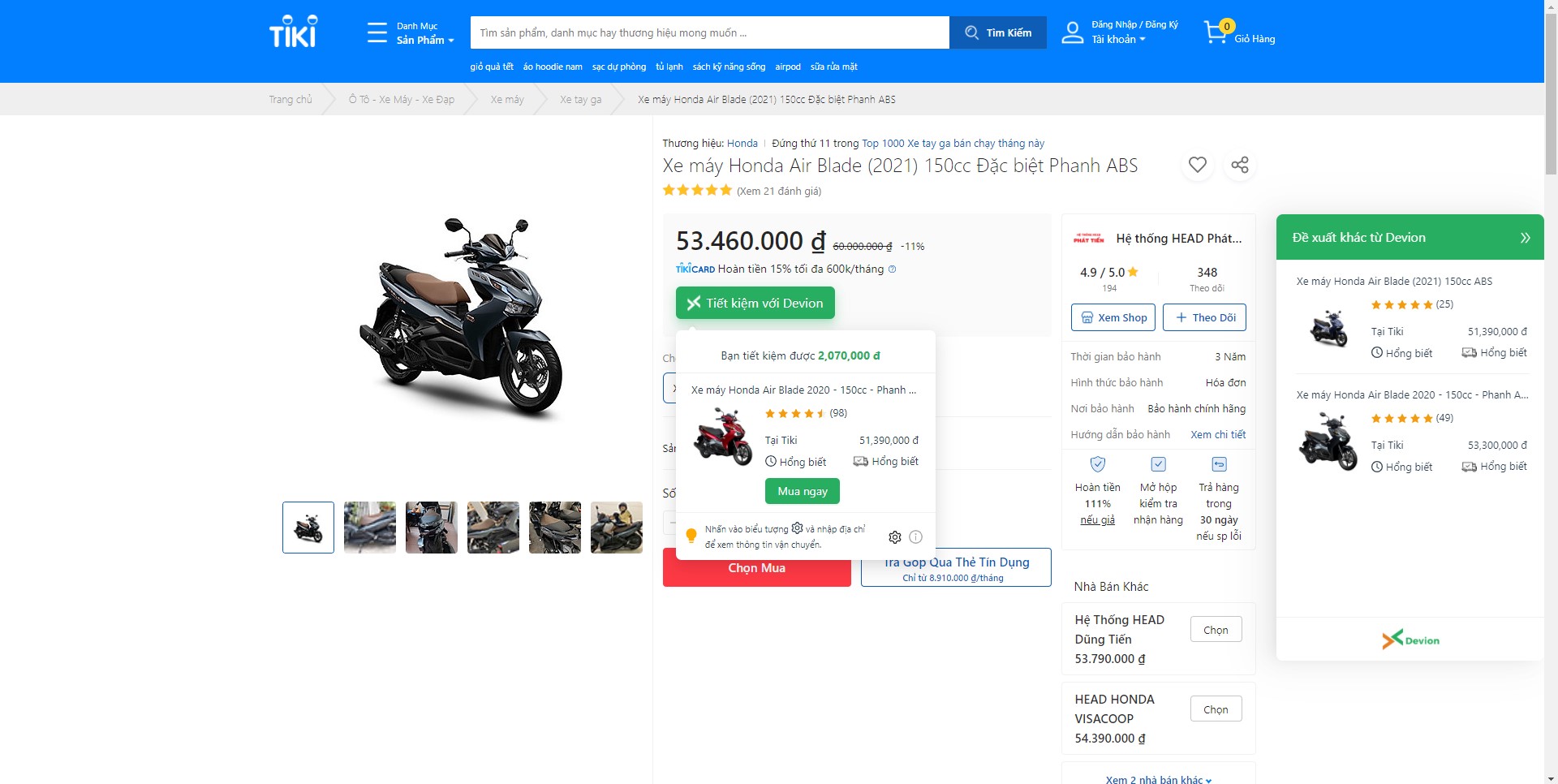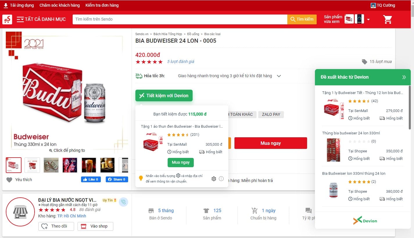 Cài đặt xong rồi là nó sẽ tự động hoạt động ngay lập tức, bạn chỉ cần truy cập Shopee, Tiki, Sendo sẽ thấy biểu tượng Devion hoạt động, các mức giá gợi ý ngay lập tức, chỉ cần chỉ chuột vào biểu tượng Devion thì sản phẩm gợi ý lập tức hiện ra.