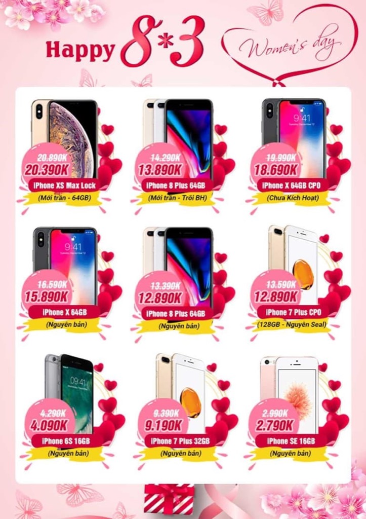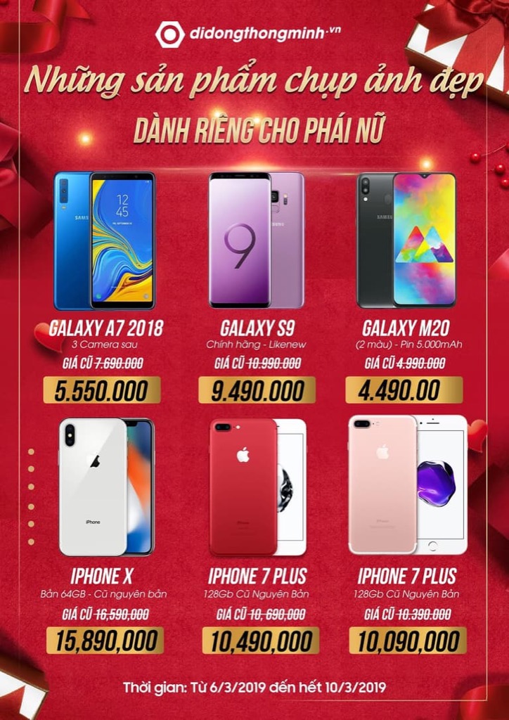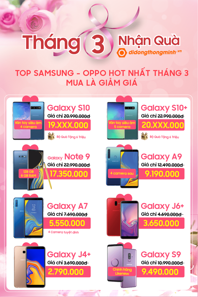 Từ những sản phẩm mới ra mắt, đắt tiền như bộ đôi Galaxy S10/S10+ đến những sản phẩm giá rẻ như Xiaomi Redmi Note 5 Pro hay Xiaomi Redmi 6A cũng đều có mức giá cực hấp dẫn để làm quà cho chị em phụ nữ nhân ngày 8/3. Chi tiết mức giá của các sản phẩm, mời các bạn xem hình ảnh dưới đây: