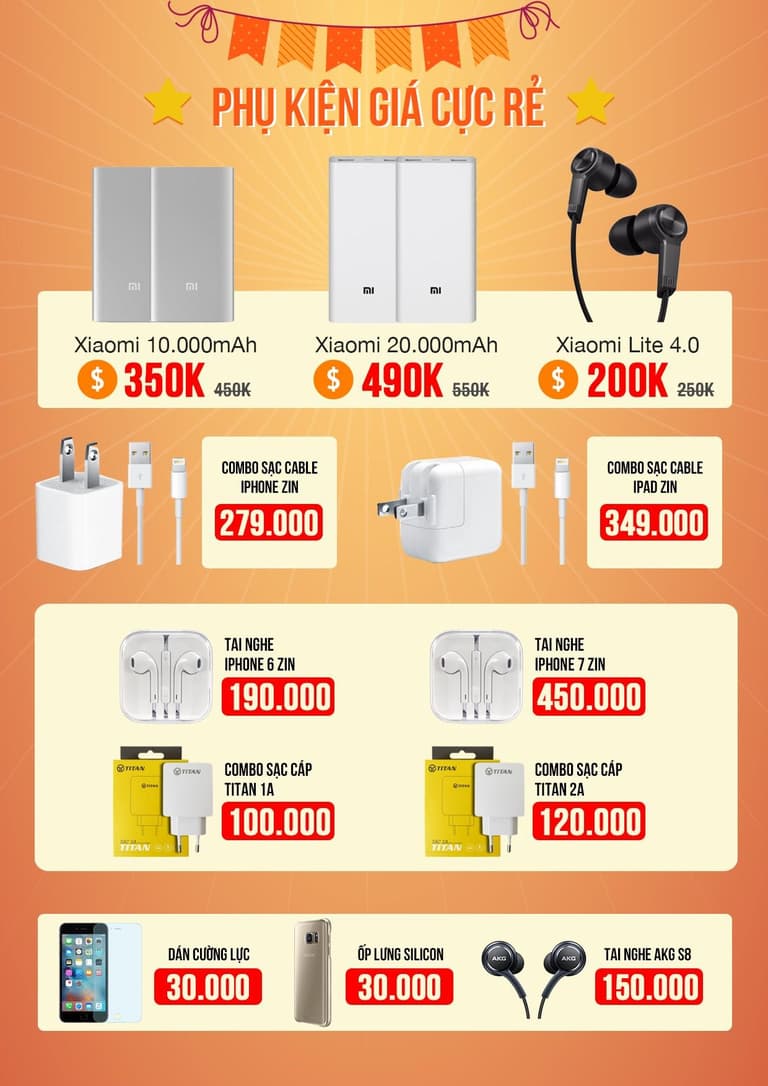 Cùng với những ưu đãi mua smartphone giá rẻ, Di Động Thông Minh còn giảm giá sâu nhiều mẫu phụ kiện cực hot. Chi tiết, mời các bạn tham khảo bảng giá phụ kiện dưới đây: