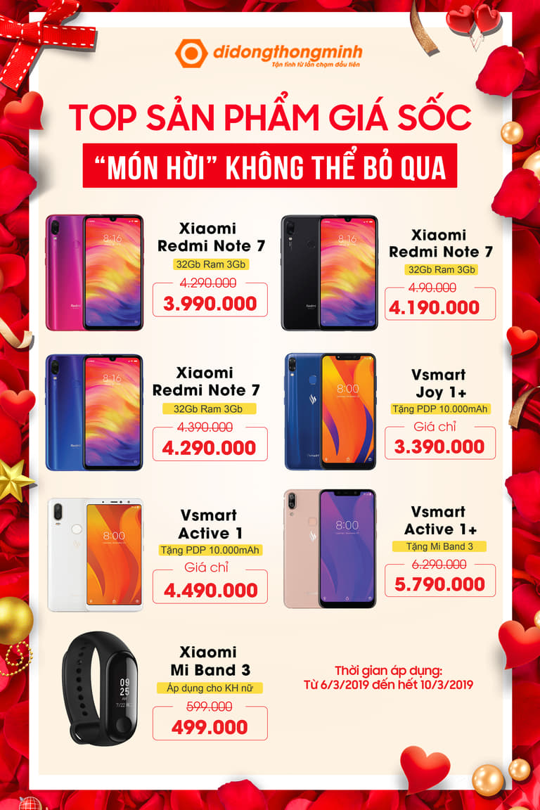 Bên cạnh những sản phẩm chụp ảnh đẹp, Di Động Thông Minh còn giảm giá nhiều mẫu điện thoại đang hot như Xiaomi Redmi Note 7 với camera 48MP; điện thoại của người Việt Vsmart Joy 1+, Active 1 hay Active 1+,… Đặc biệt, nếu bạn là khách hàng nữ đến mua vòng tay thông minh Miband 3 trong những ngày này sẽ được giảm trực tiếp 100.000đ khiến giá máy chỉ còn 499.000đ.