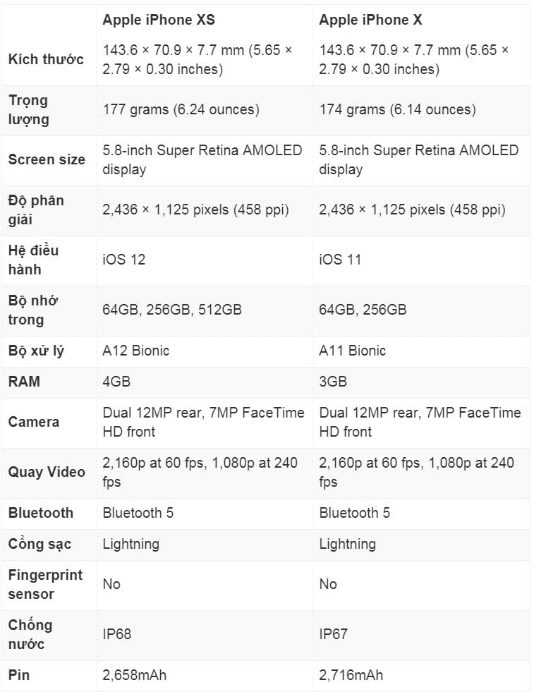 Một số thông số kỹ thuật về Iphone X và Iphone XS như mô tả dưới đây cũng gần như tương đồng nhau: