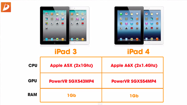 Điểm khác biệt lớn về cấu hình này cũng là điểm khác biệt lớn nhất và có thể xem là duy nhất đáng để ảnh hưởng khi chúng ta quyết định mua. Phải thừa nhận ipad 4 qsd nhanh hơn một chút, nhưng trong sử dụng thường ngày của chúng ta, cả 2 chiếc ipad đều sẽ đáp ứng tốt các thao tác , thật khó để nhận ra khác biệt nếu bạn không đặt chúng cạnh nhau mà xét thật kỹ.
