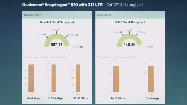 Snapdragon 820 còn được tích hợp modem mới nhất, hỗ trợ LTE với Cat 12 cho tốc độ tải lý thuyết 600 Mbps, Cat 13 tải lên 150 Mbps. Để dễ hình dung thì mạng 3G chúng ta đang dùng có tốc độ khoảng 21.6Mps là gần như cao nhất. Ngoài ra, Snap 820 cũng hỗ trợ kết nối USB 3.0 và công nghệ sạc nhanh QuickCharge 3.0.