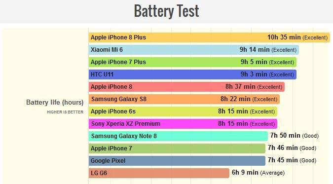 Bảng test thời lượng pin của 8 Plus vẫn đứng đầu trong các dòng máy cùng phân khúc. Với thời lượng gần 11h 8 Plus chắc chắn là chiếc smartphone đứng đầu cần sở hữu khi muốn ua để chơi game lâu dài.