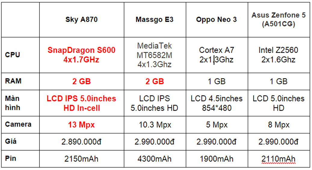 Với mức giá hiện đang niêm yết tại DĐTM là 2.990.000đ thì Sky A870 đang có giá tương đương chiếc Massgo E3, Oppo Neo 3 hay Zenfone 5 mặc dù A870 từng là dòng sản phẩm cao cấp.