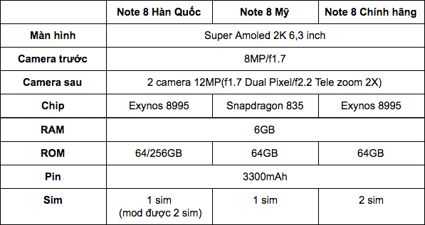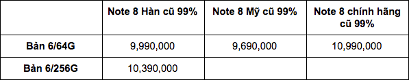 Các bạn có thể tham khảo giá Note 8 Hàn so với các phiên bản khác:
