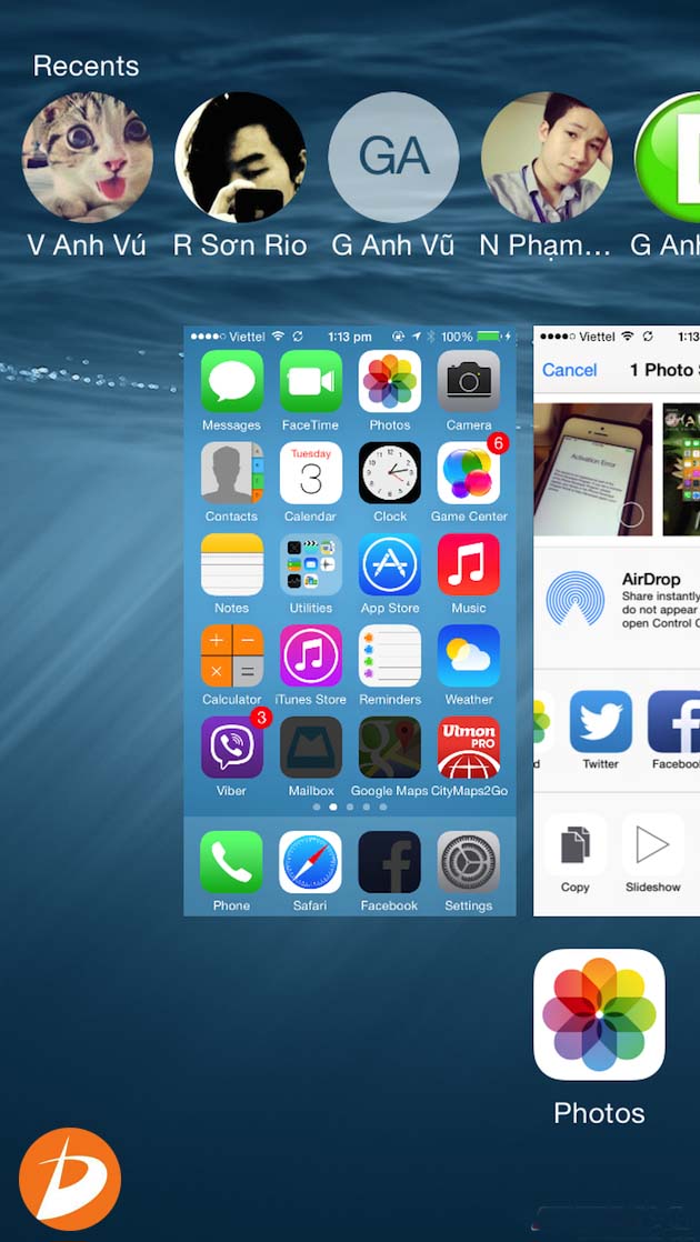 Màn hình đa nhiệm của iOS 7 chứng kiện sự lột xác không chỉ về giao diện mà còn cả tính năng, nhưng với iOS 8 thì nó còn hoàn thiện hơn với việc bổ sung danh sách một số những liên hệ gần nhất. Bằng cách bầm vào các biểu tượng danh bạ này, chúng ta có thể gọi điện, nhắn tin hay gọi Facetime nhanh cho những người thân hay bạn bè mới liên hệ gần nhất.