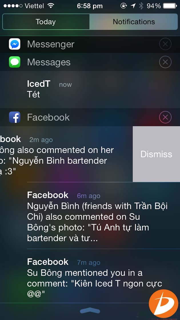 Với iOS 7, người dùng chỉ có thể vuốt sang trái để bỏ qua thông báo vừa nhận được. Kể từ iOS 8, người dùng giờ có thể vuốt thông báo đó xuống để trả lời tin nhắn hay xác nhận lịch hẹn. Ngoài ra, mỗi thông báo nhất định trong Trung tâm thông báo cũng có thể được bỏ qua bằng cách vuốt sang trái thay vì chọn Clear để xóa tất cả.