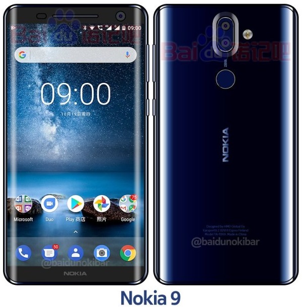 Theo nokiapoweruser, hình ảnh Nokia 9 màu xanh lam xuất phát từ trang Baidu, Trung Quốc. Ngoài màu sắc mới thì thiết kế của Nokia 9 cũng giống như những gì xuất hiện trước đó. Mặt trước và mặt sau phủ kính cong 3D đẹp mắt, viền cạnh trên và dưới cũng rất hẹp, nút Home vật lý đã bị lược bỏ.