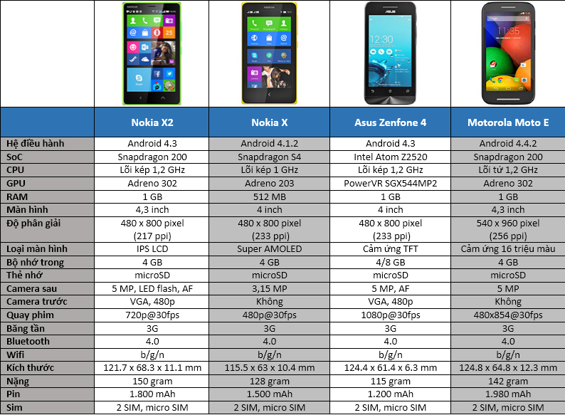Nhìn vào bảng thông số kỹ thuật trên thì cả 4 sản phẩm đều thuộc phân khúc giá rẻ, phù hợp với người dùng có túi tiền eo hẹp nhưng vẫn đem tới những trải nghiệm cần thiết trên một chiếc smartphone Android. Về cấu hình, duy chỉ có Nokia X là sở hữu chip Snapdragon S4 lõi kép 1 GHz và RAM 512 MB, còn 2 sản phẩm còn lại đều có cấu hình ngang nhau là vi xử lí lõi kép 1,2 GHz và RAM 1GB cùng bộ nhớ 4 GB.