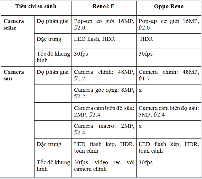 Bảng so sánh là minh chứng khách quan nhất làm nổi bật cấu tạo camera trên điện thoại Reno2 F. Nâng cấp toàn diện này cho thấy đây là sản phẩm vượt trội trong tầm giá.
