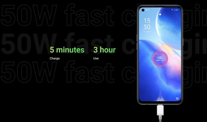 Pin 4.300 mAh lớn hơn một chút so với Reno4 (4.015 mAh) và sạc nhanh hơn – từ 30W, nó tăng lên 50W. Điều thú vị là nó đi kèm với bộ sạc 65W giống như người anh em 5G (việc sạc đầy mất 48 phút).
