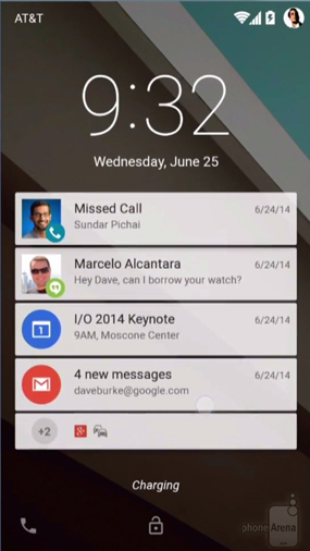 Lúc này, thông báo trên hệ thống sẽ có tính tương tác cao hơn hẳn. Trong đó, Google khẳng định hãng sẽ sử dụng các thuật toán thông minh để ưu tiên hiển thị những thông báo có ích nhất cho người dùng trước. Ngoài ra, khi nhấn hai lần vào một thông báo trên màn hình khóa, bạn sẽ được điều hướng đến ứng dụng gửi thông báo đó. Ngoài ra, thông báo trên Android L cũng sẽ có diện tích hiển thị trên màn hình lớn hơn những gì các phiên bản Android trước đó sở hữu.