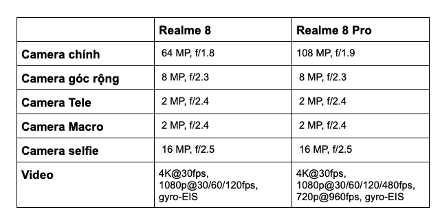Cụm camera chính của Realme 8 và realme 8 Pro, được thiết kế với 4 ống kính riêng biệt, đặt trong một mô-đun hình vuông kèm với đèn flash LED. Dưới đây là thông số camera của 2 máy.