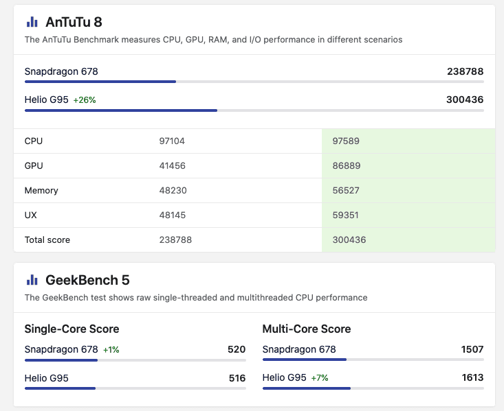 So sánh hiệu năng giữa chip Helio G95 (Realme 8) với Snapdragon 678( Redmi Note 10), theo trang báo uy tín nano review.net. Realme 8 mang lại hiệu suất CPU, GPU cao hơn Redmi Note 10. Nhưng về khả năng tiết kiệm pin thì chip Snapdragon 678 lại tốt hơn Helio G95.