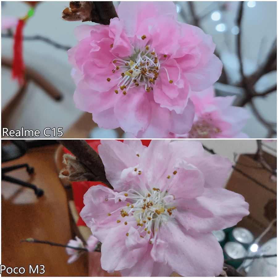 Ở đây mình đã chụp một bông hoa đào, và mình cũng so sánh trực tiếp luôn với camera macro của Poco M3 hôm trước thì thấy rằng: ảnh macro trên Realme C15 ăn đứt Poco M3 về màu sắc và độ chi tiết. Các chi tiết nhỏ như nhụy hoa được thể hiện rõ ràng hơn so với đối thủ dù có cùng độ phân giải. Vì vậy, những bạn nào mà thích chụp cận cảnh thì hãy lưu ý điều này khi lựa chọn điện thoại trong phân khúc 3 triệu nhé!