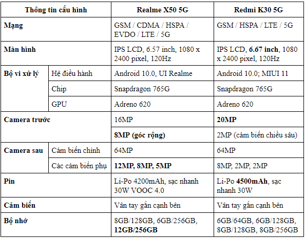 1. Tổng hợp thông số cấu hình Realme X50 5G vs Redmi K30 5G