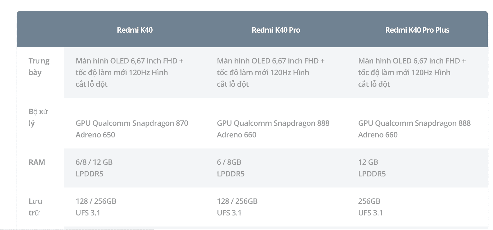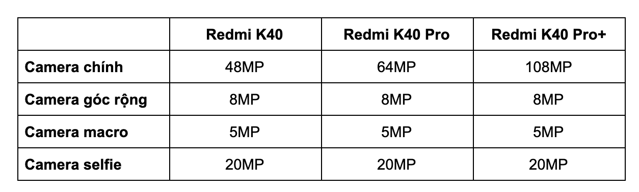 Phiên bản Pro và Pro+ có độ phân giải camera chính cao hơn phiên bản thường. K40 Pro+ được nâng cấp lên cảm biến 108MP HM2 của Samsung. Còn lại về thông số camera góc rộng và camera tele thì giống nhau. Chất lượng chụp ảnh như nào nếu có sản phẩm trêbn tay mình sẽ đánh giá cho các bạn xem nhé.