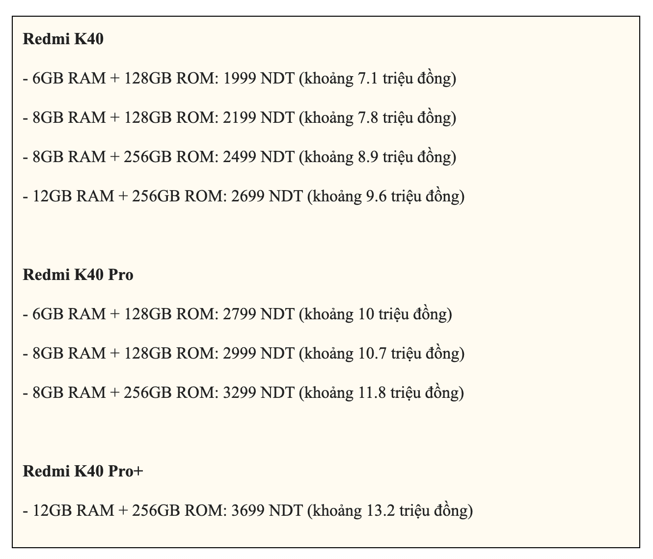 Trên đây là toàn bộ thông tin chính về Redmi K40 series mới được ra mắt trong sự kiện của Redmi. Cụ thể thực hư trải nghiệm sản phẩm này như thế nào thì các bạn hãy chờ khi chúng mình có sản phẩm trên tay nhé. Đừng quên truy cập thường xuyên vào webdite didongthongminh.vn để theo dõi những thông tin mới nhất về công nghệ.