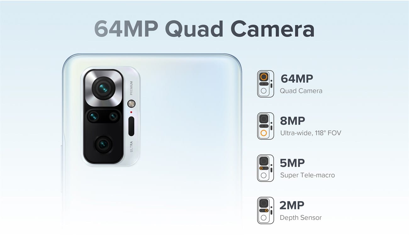 Redmi Note 10 Pro không chỉ có hiệu năng tốt, màn hình đẹp mà máy còn có hệ thống camera đáp ứng mọi nhu cầu hiện nay. Camera chính của máy 64MP hỗ trợ chụp ảnh sắc nét, kèm theo đó là 3 camera hot trend: camera góc rộng 8MP, camera macro 5MP, camera đo chiều sâu 2MP.