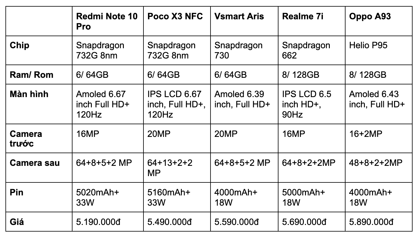 Nhìn vào bảng so sánh dễ thấy rằng hiệu năng của Redmi Note 10 Pro và Poco X3 NFC có hiệu năng có thể nói mạnh nhất phân khúc. So sánh hiệu năng giữa 732G và 730 trên Vsmart Aris thì chỉ chênh lệch nhau 1 chút về hiệu năng của CPU nhưng GPU nhưng đổi lại Note 10 pro lại ăn đứt màn hình của Vsmart Aris.