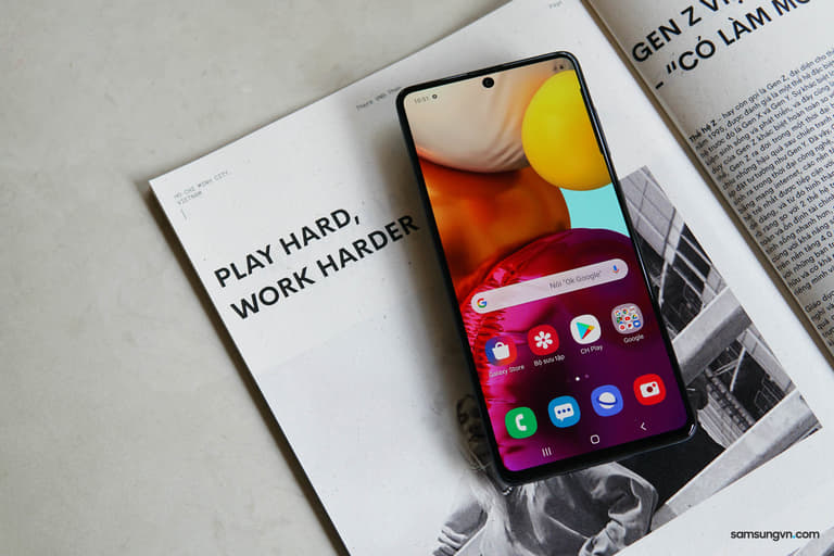 Tương tự như Galaxy A51 thì A71 cũng được sử dụng tấm nền Super AMOLED, độ phân giải full HD+ các cạnh viền đã được làm mỏng, ngay cả cạnh dưới thường là khuyết điểm của máy tầm trung cũng được xử lý gọn gàng. Chính vì thế, bạn sẽ có màn hình 6,7 inch vô cực mở rộng về tất cả các phía, mang đến không gian trải nghiệm xem video và “chiến game” đỉnh cao trong tầm giá.