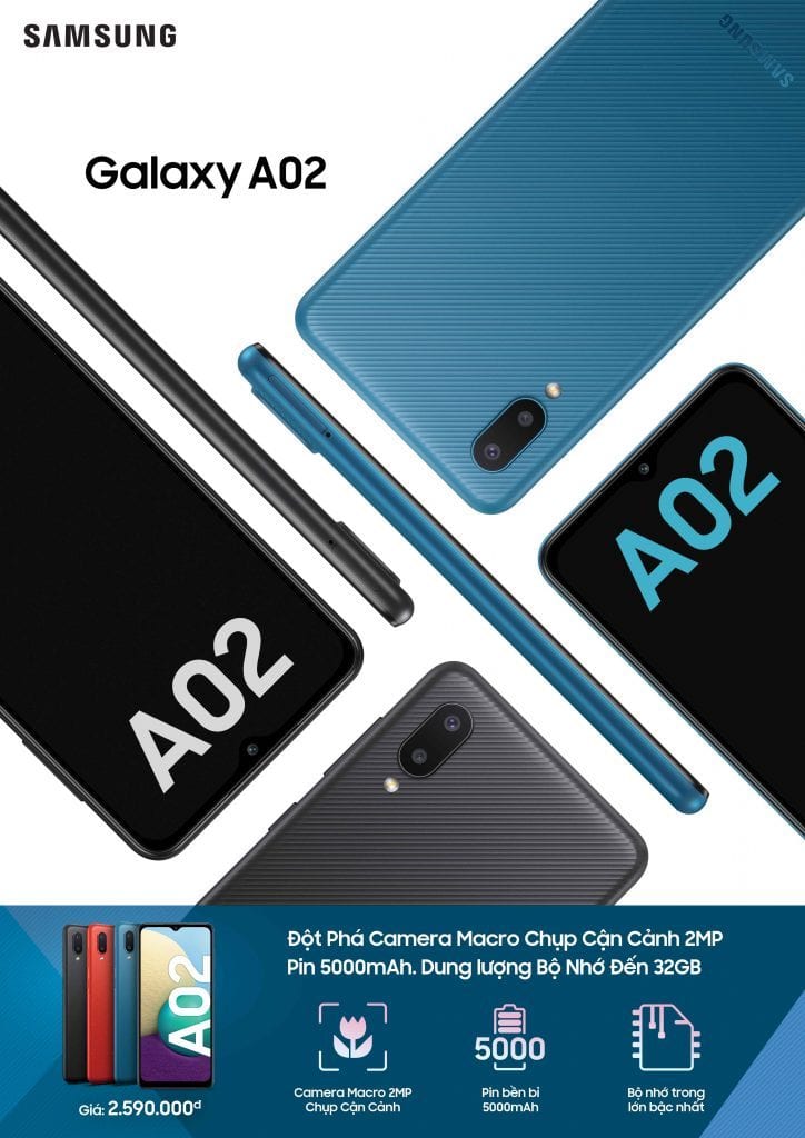 Samsung vừa chính thức ra mắt mẫu điện thoại giá rẻ mới Galaxy A02. Đây là sản phẩm được tích hợp hàng loạt những công nghệ mới nhất như camera kép có độ phân giải 13MP và camera macro chụp cận cảnh, dung lượng pin 5000mAh, bộ nhớ trong 32GB lớn và màn hình 6.5 inch.